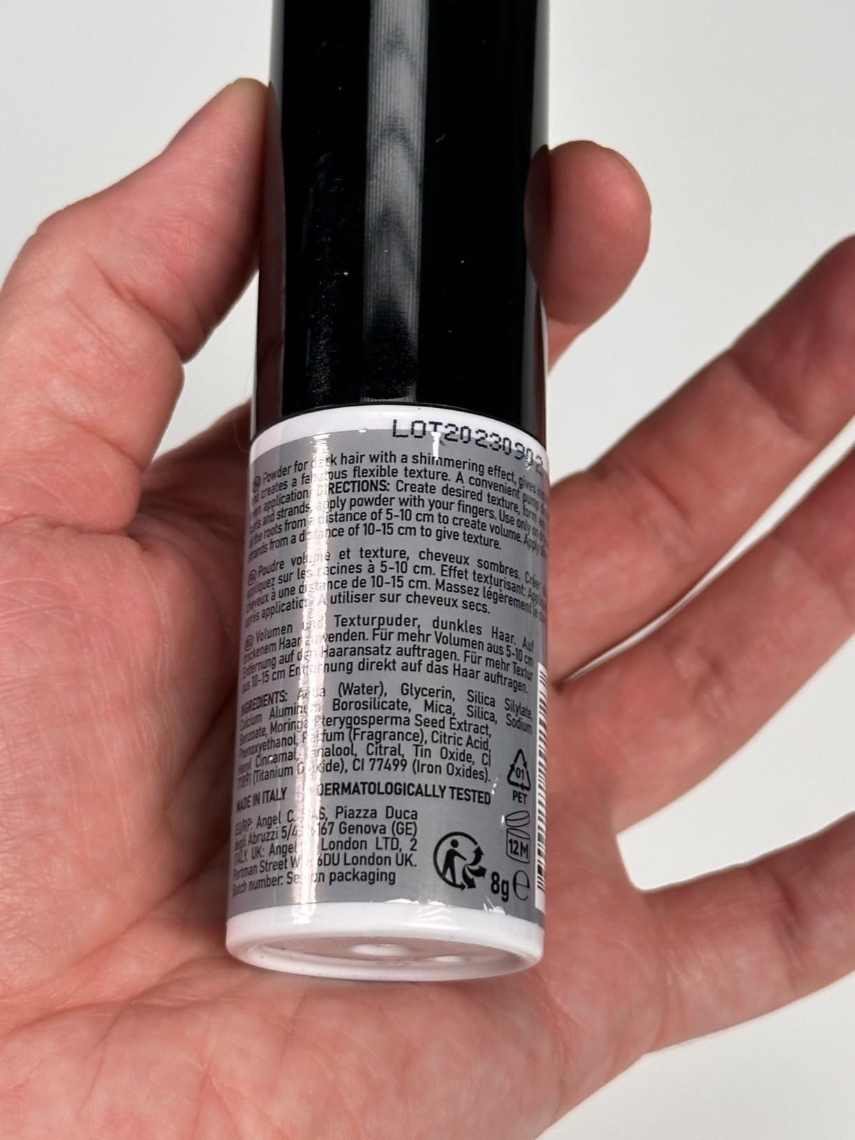 Curioso bote de polvo texturizante, practico para llevar en el bolsillo o en la guantera del coche y darte un retoque de volumen en un instante.No apelmaza el cabello pero si lo hace un poco "rigido" dotandole de cierto volumen del que careceria de modo natural.Para mi es muy interesante para el verano, que vas en moto a la playa y sales de ella con el pelo hecho un cuadro, un toque de polvo, te lo peinas con la mano y estas presentable para ir a tomar algo sin problema aun a pesar del efecto apelmazante de la salitre del mar.
